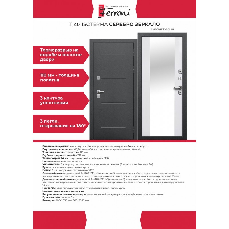 - Внутреннее покрытиеМДФ-панель 10 мм с зеркалом, цвет – «эмалит белый»
