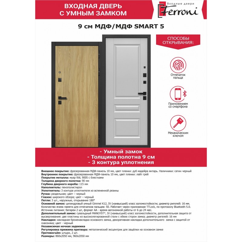 - Основной замокцилиндровый умный Гиммал K12, IV (наивысший) класс взломостойкости; диаметр ригелей: 16 мм. Количество ячеек памяти для отпечатков пальцев: 50. Работает через приложение TTЛок, по протоколу Блютуз 5.0