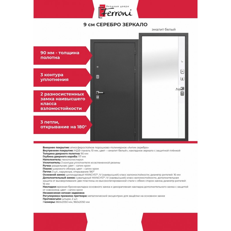 - Внутреннее покрытиеМДФ-панель 10 мм, встроенное зеркало с защитной плёнкой, цвет: эмалит белый